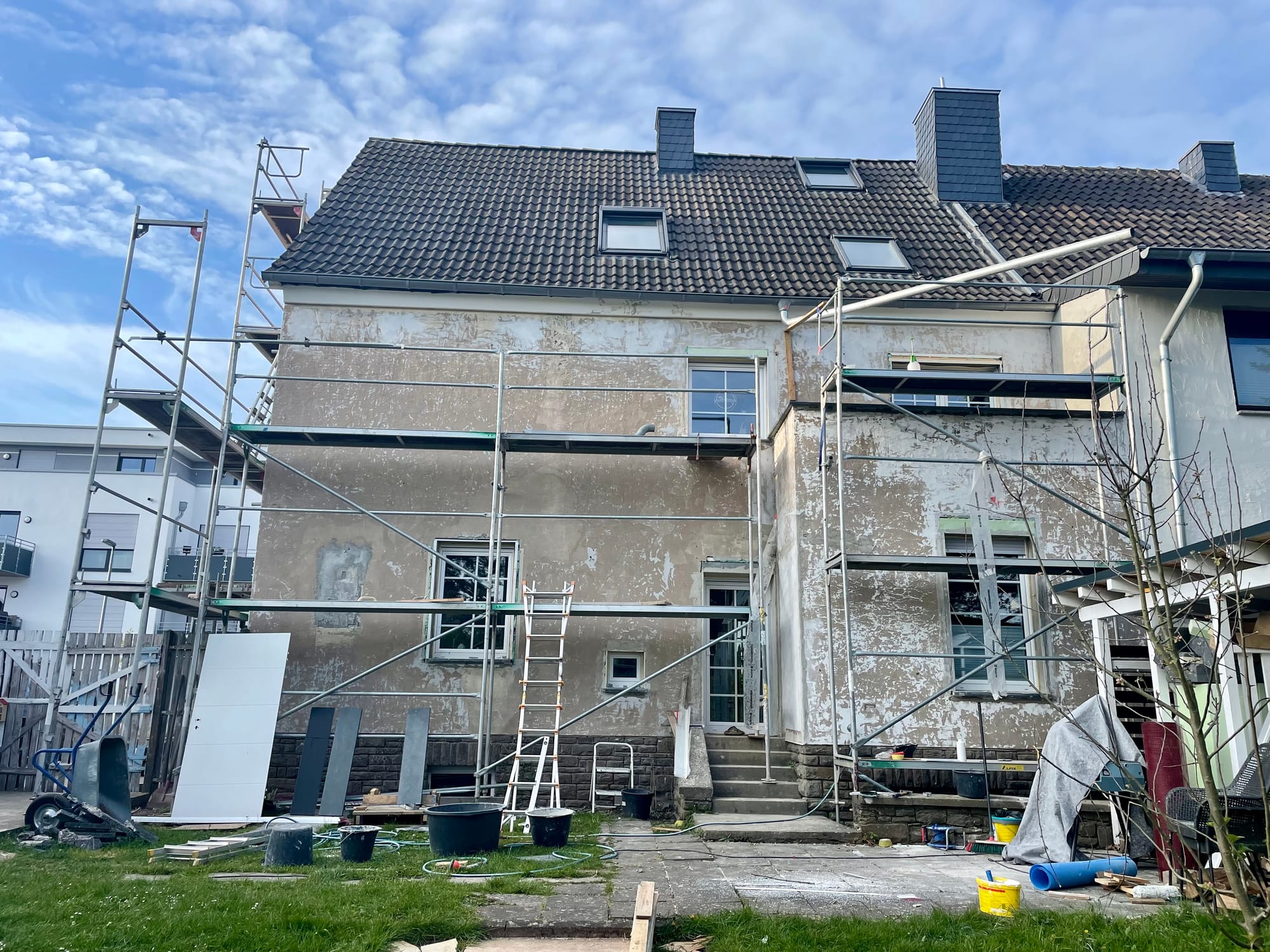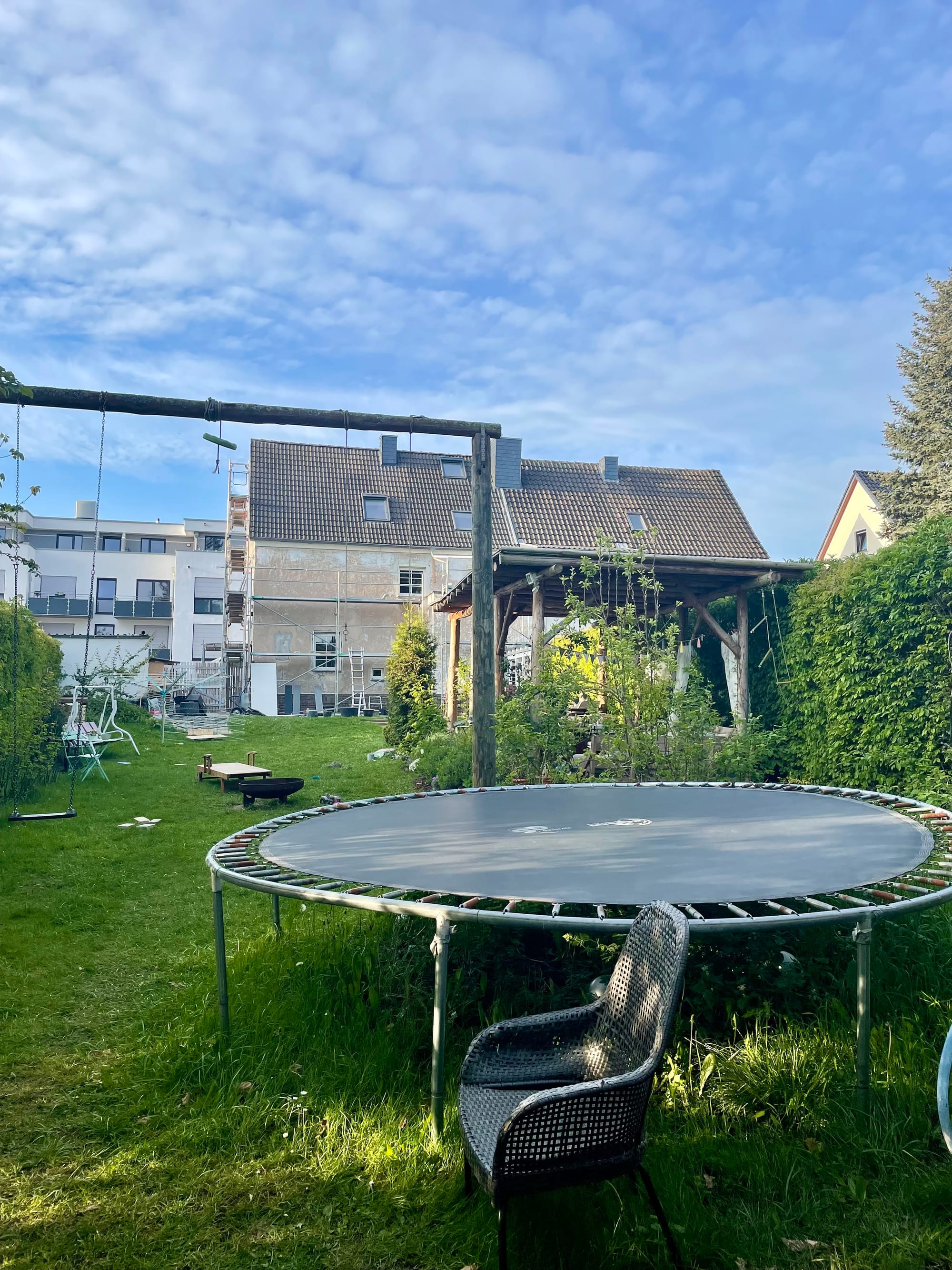 Später, als ich im Garten saß, mein Mann und liebe Freunde und Schwiegervater auf dem Gerüst dabei die Fassade unseres großen Hauses zu machen, da füllte sich der Garten mit spielenden Kindern, am Matschen, am Trampolin springen, am Dinosaurier jagen, meine Freundin immer noch da, auf dem Sofa draußen in eine Decke gehüllt, selig, als sie sich verabschiedete.